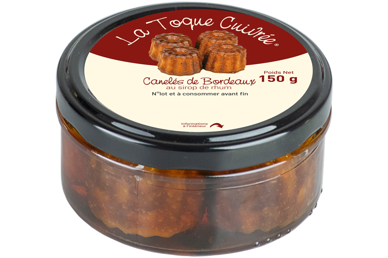 Le Canelé, pâtisserie gourmande d’origine bordelaise, ne se présente plus tant son succès dépasse les frontières. Décliné en verrines de 4 Canelés Bouchée conservés dans leur sirop de rhum, il s’emporte, se conserve longuement et peut même voyager en toute occasion.